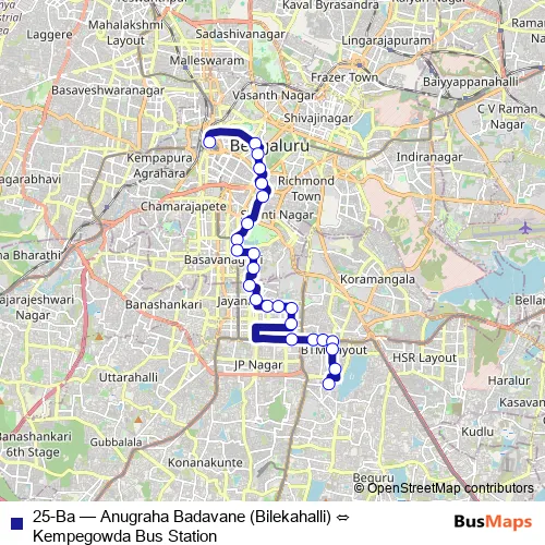 See why over 2 million users trust and consider busmaps.com as the best public transport website. busmaps gives you Bengaluru Buses suggested routes, real-time bus tracker, line route maps in Bengaluru, and helps to find the closest 25-Ba bus stops near you. No internet available? Download an offline PDF map and bus schedule for the 25-Ba bus to take on your trip.