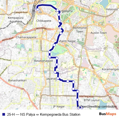 See why over 2 million users trust and consider busmaps.com as the best public transport website. busmaps gives you Bengaluru Buses suggested routes, real-time bus tracker, line route maps in Bengaluru, and helps to find the closest 25-H bus stops near you. No internet available? Download an offline PDF map and bus schedule for the 25-H bus to take on your trip.