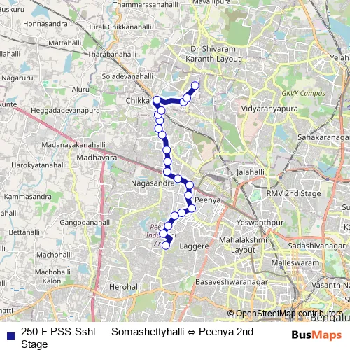 The first stop of the 250-F PSS-Sshl bus route is Peenya 2nd Stage and the last stop is Somashettyhalli. 250-F PSS-Sshl (Somashettyhalli ⇔ Peenya 2nd Stage) is operational during everyday.