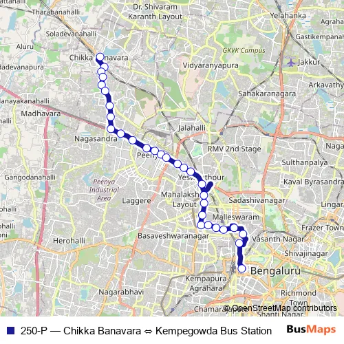 The first stop of the 250-P bus route is Chikka Banavara and the last stop is Kempegowda Bus Station. 250-P (Chikka Banavara ⇔ Kempegowda Bus Station) is operational during everyday.