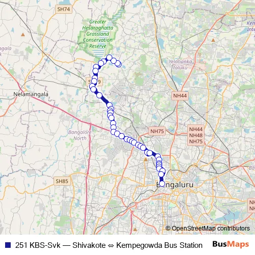 The first stop of the 251 KBS-Svk bus route is Shivakote and the last stop is Kempegowda Bus Station. 251 KBS-Svk (Shivakote ⇔ Kempegowda Bus Station) is operational during everyday.