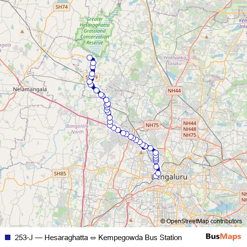 The first stop of the 253-J bus route is Kempegowda Bus Station and the last stop is Hesaraghatta. 253-J (Hesaraghatta ⇔ Kempegowda Bus Station) is operational during everyday.