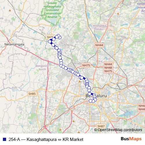 The first stop of the 254-A bus route is Kasaghattapura and the last stop is KR Market. 254-A (Kasaghattapura ⇔ KR Market) is operational during everyday.