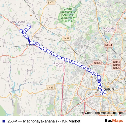 The first stop of the 258-A bus route is KR Market and the last stop is Machonayakanahalli. 258-A (Machonayakanahalli ⇔ KR Market) is operational during everyday.