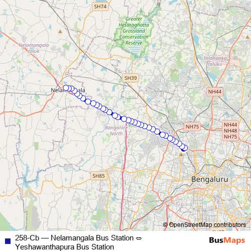 The first stop of the 258-Cb bus route is Yeshawanthapura Bus Station and the last stop is Nelamangala Bus Station. 258-Cb (Nelamangala Bus Station ⇔ Yeshawanthapura Bus Station) is operational during everyday.