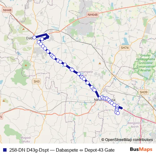 The first stop of the 258-DN D43g-Dspt bus route is Dabaspete and the last stop is Depot-43 Gate. 258-DN D43g-Dspt (Dabaspete ⇔ Depot-43 Gate) is operational during everyday.