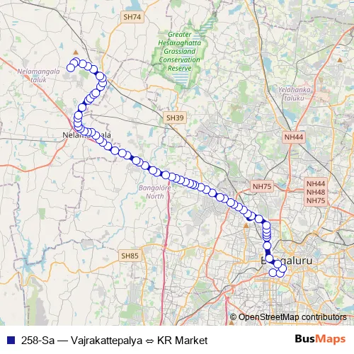 The first stop of the 258-Sa bus route is KR Market and the last stop is Vajrakattepalya. 258-Sa (Vajrakattepalya ⇔ KR Market) is operational during everyday.