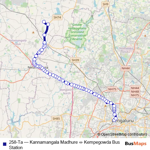The first stop of the 258-Ta bus route is Kempegowda Bus Station and the last stop is Kannamangala Madhure. 258-Ta (Kannamangala Madhure ⇔ Kempegowda Bus Station) is operational during everyday.