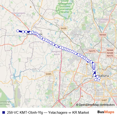 Yelachagere. 258-VC KMT-Obnh-Ylg (Yelachagere ⇔ KR Market) is operational during everyday.