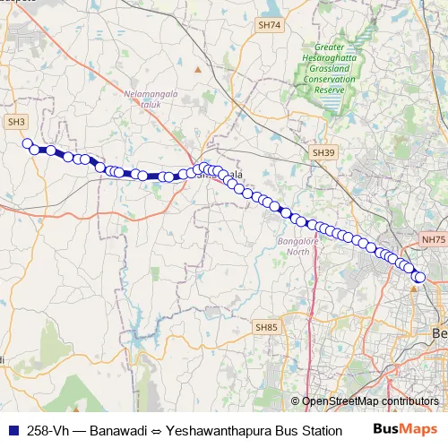 The first stop of the 258-Vh bus route is Banawadi and the last stop is Yeshawanthapura Bus Station. 258-Vh (Banawadi ⇔ Yeshawanthapura Bus Station) is operational during everyday.
