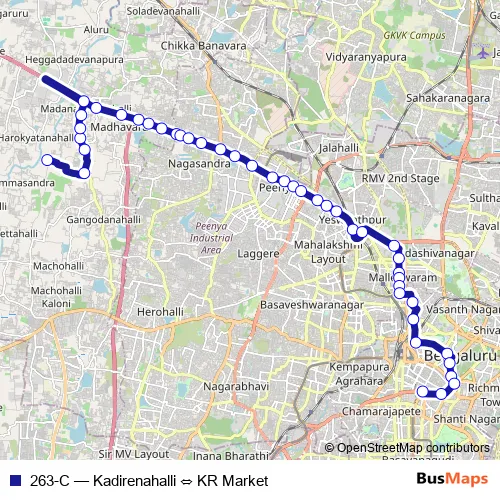 The first stop of the 263-C bus route is Kadirenahalli and the last stop is KR Market. 263-C (Kadirenahalli ⇔ KR Market) is operational during everyday.