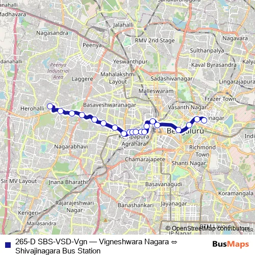 See why over 2 million users trust and consider busmaps.com as the best public transport website. busmaps gives you Bengaluru Buses suggested routes, real-time bus tracker, line route maps in Bengaluru, and helps to find the closest 265-D SBS-VSD-Vgn bus stops near you. No internet available? Download an offline PDF map and bus schedule for the 265-D SBS-VSD-Vgn bus to take on your trip.