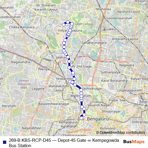 The first stop of the 269-B KBS-RCP-D45 bus route is Kempegowda Bus Station and the last stop is Depot-45 Gate. 269-B KBS-RCP-D45 (Depot-45 Gate ⇔ Kempegowda Bus Station) is operational during everyday.