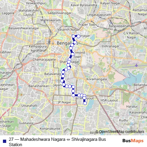 The first stop of the 27 bus route is Shivajinagara Bus Station and the last stop is Mahadeshwara Nagara. 27 (Mahadeshwara Nagara ⇔ Shivajinagara Bus Station) is operational during everyday.