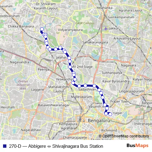 The first stop of the 270-D bus route is Abbigere and the last stop is Shivajinagara Bus Station. 270-D (Abbigere ⇔ Shivajinagara Bus Station) is operational during everyday.