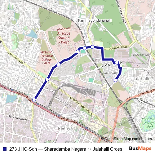 The first stop of the 273 JHC-Sdn bus route is Jalahalli Cross and the last stop is Sharadamba Nagara. 273 JHC-Sdn (Sharadamba Nagara ⇔ Jalahalli Cross) is operational during everyday.