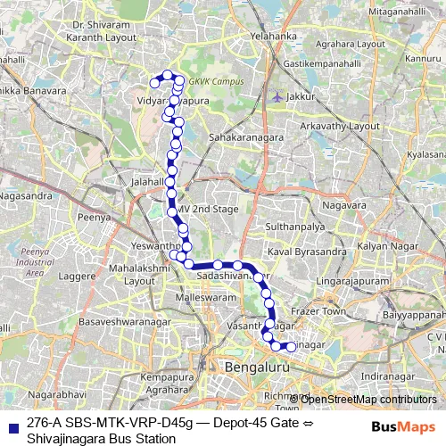 See why over 2 million users trust and consider busmaps.com as the best public transport website. busmaps gives you Bengaluru Buses suggested routes, real-time bus tracker, line route maps in Bengaluru, and helps to find the closest 276-A SBS-MTK-VRP-D45g bus stops near you. No internet available? Download an offline PDF map and bus schedule for the 276-A SBS-MTK-VRP-D45g bus to take on your trip.