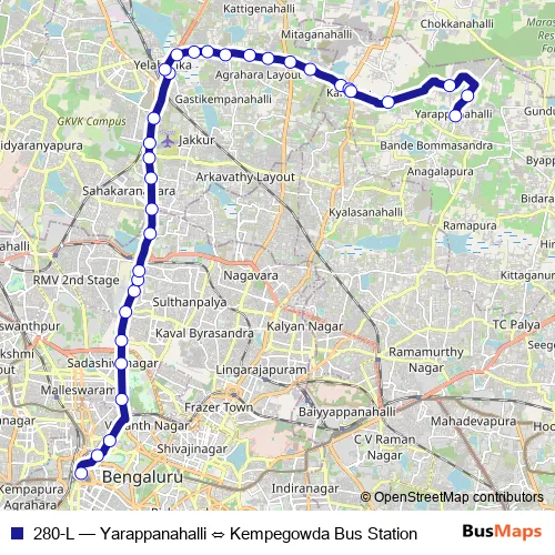 Bus 280-L - Yarappanahalli ⇔ Kempegowda Bus Station in Bengaluru: Stops & Timetable