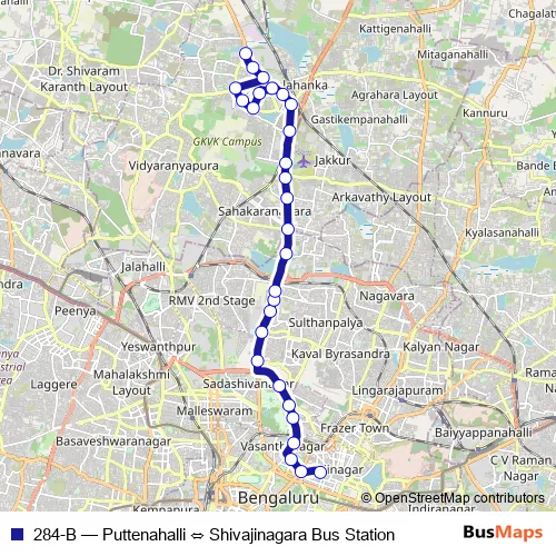 The first stop of the 284-B bus route is Shivajinagara Bus Station and the last stop is Puttenahalli. 284-B (Puttenahalli ⇔ Shivajinagara Bus Station) is operational during everyday.