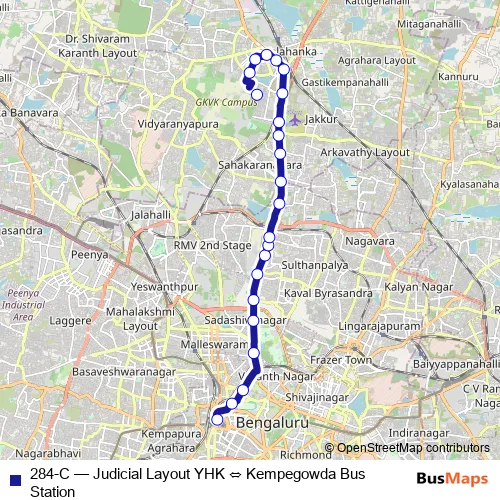 The first stop of the 284-C bus route is Kempegowda Bus Station and the last stop is Judicial Layout Yhk. 284-C (Judicial Layout YHK ⇔ Kempegowda Bus Station) is operational during everyday.