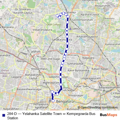 The first stop of the 284-D bus route is Yelahanka Satellite Town and the last stop is Kempegowda Bus Station. 284-D (Yelahanka Satellite Town ⇔ Kempegowda Bus Station) is operational during everyday.