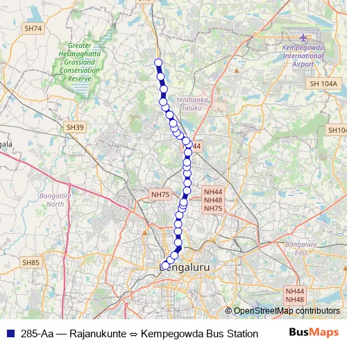 The first stop of the 285-Aa bus route is Kempegowda Bus Station and the last stop is Rajanukunte. 285-Aa (Rajanukunte ⇔ Kempegowda Bus Station) is operational during everyday.