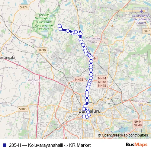 The first stop of the 285-H bus route is Koluvarayanahalli and the last stop is KR Market. 285-H (Koluvarayanahalli ⇔ KR Market) is operational during everyday.