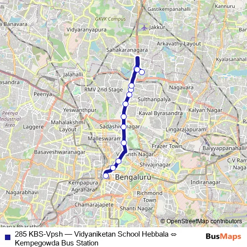 The first stop of the 285 KBS-Vpsh bus route is Kempegowda Bus Station and the last stop is Vidyaniketan School Hebbala. 285 KBS-Vpsh (Vidyaniketan School Hebbala ⇔ Kempegowda Bus Station) is operational during everyday.
