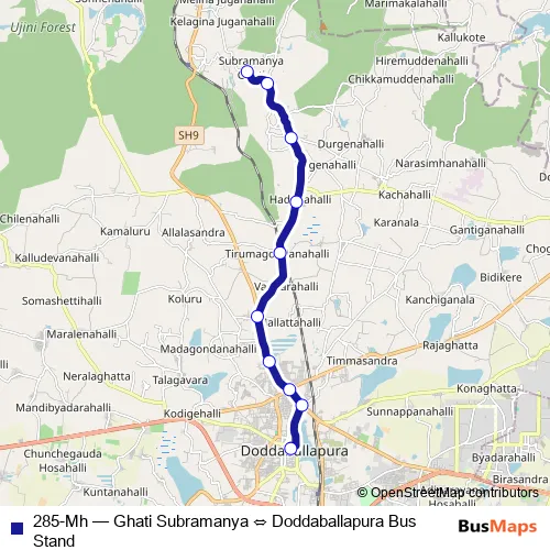 The first stop of the 285-Mh bus route is Doddaballapura Bus Stand and the last stop is Ghati Subramanya. 285-Mh (Ghati Subramanya ⇔ Doddaballapura Bus Stand) is operational during everyday.