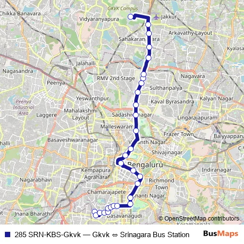 See why over 2 million users trust and consider busmaps.com as the best public transport website. busmaps gives you Bengaluru Buses suggested routes, real-time bus tracker, line route maps in Bengaluru, and helps to find the closest 285 SRN-KBS-Gkvk bus stops near you. No internet available? Download an offline PDF map and bus schedule for the 285 SRN-KBS-Gkvk bus to take on your trip.