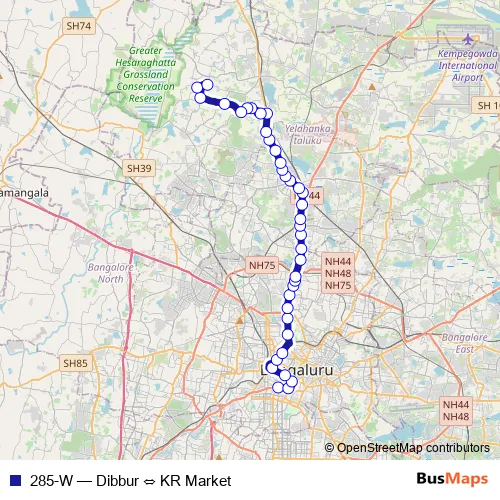 The first stop of the 285-W bus route is KR Market and the last stop is Dibbur. 285-W (Dibbur ⇔ KR Market) is operational during everyday.