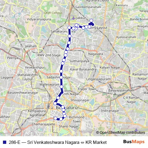 The first stop of the 286-E bus route is Sri Venkateshwara Nagara and the last stop is KR Market. 286-E (Sri Venkateshwara Nagara ⇔ KR Market) is operational during everyday.