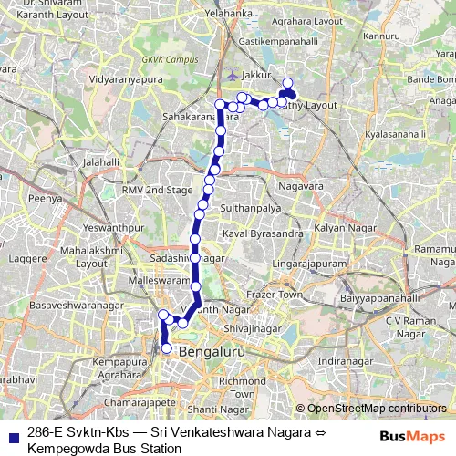 The first stop of the 286-E Svktn-Kbs bus route is Sri Venkateshwara Nagara and the last stop is Kempegowda Bus Station. 286-E Svktn-Kbs (Sri Venkateshwara Nagara ⇔ Kempegowda Bus Station) is operational during everyday.