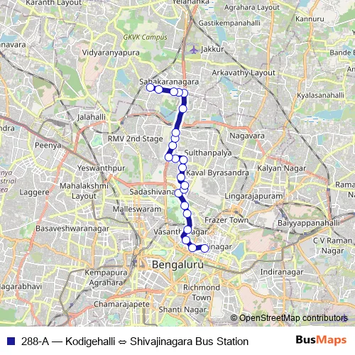 The first stop of the 288-A bus route is Shivajinagara Bus Station and the last stop is Kodigehalli. 288-A (Kodigehalli ⇔ Shivajinagara Bus Station) is operational during everyday.