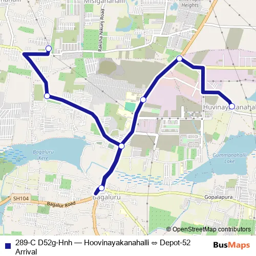 The first stop of the 289-C D52g-Hnh bus route is Hoovinayakanahalli and the last stop is Depot-52 Arrival. 289-C D52g-Hnh (Hoovinayakanahalli ⇔ Depot-52 Arrival) is operational during everyday.