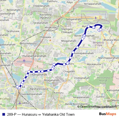 The first stop of the 289-P bus route is Hunasuru and the last stop is Yelahanka Old Town. 289-P (Hunasuru ⇔ Yelahanka Old Town) is operational during everyday.