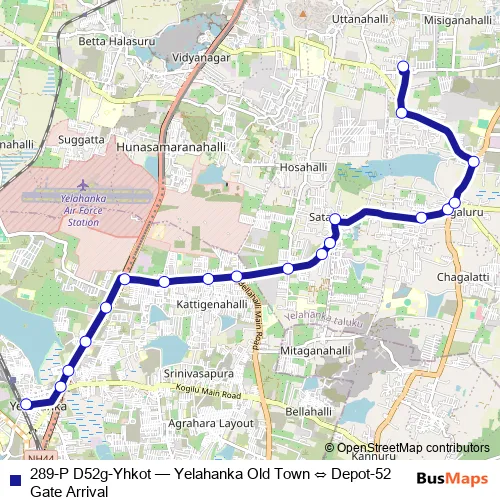 Depot-52 Gate Arrival. 289-P D52g-Yhkot (Yelahanka Old Town ⇔ Depot-52 Gate Arrival) is operational during everyday.