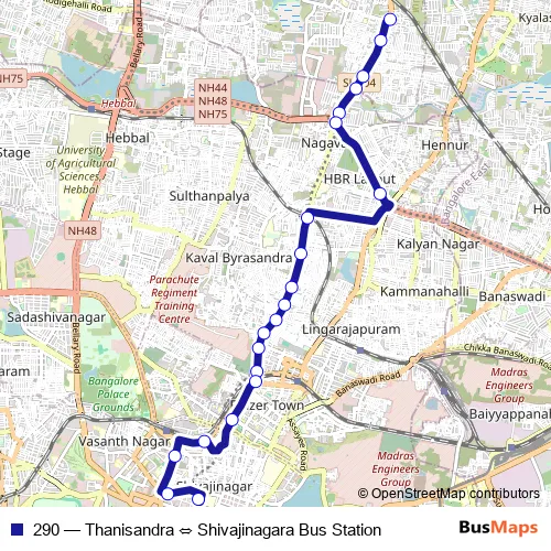 The first stop of the 290 bus route is Thanisandra and the last stop is Shivajinagara Bus Station. 290 (Thanisandra ⇔ Shivajinagara Bus Station) is operational during everyday.