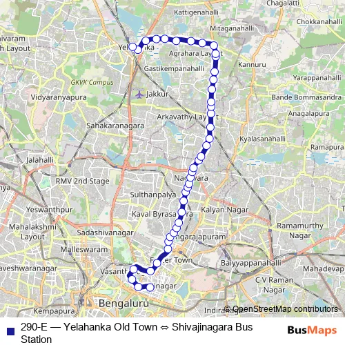 The first stop of the 290-E bus route is Shivajinagara Bus Station and the last stop is Yelahanka Old Town. 290-E (Yelahanka Old Town ⇔ Shivajinagara Bus Station) is operational during everyday.