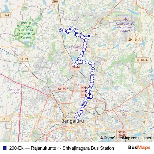 The first stop of the 290-Ek bus route is Rajanukunte and the last stop is Shivajinagara Bus Station. 290-Ek (Rajanukunte ⇔ Shivajinagara Bus Station) is operational during everyday.