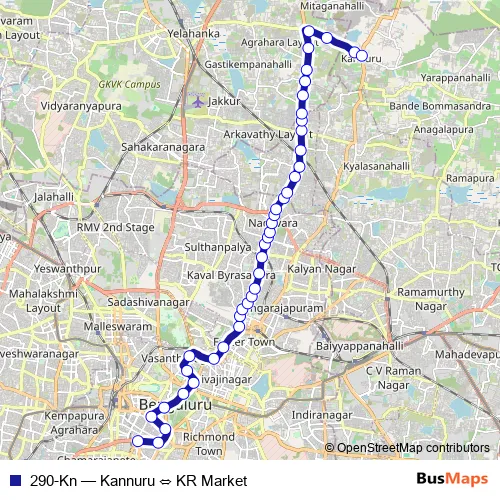 The first stop of the 290-Kn bus route is KR Market and the last stop is Kannuru. 290-Kn (Kannuru ⇔ KR Market) is operational during everyday.