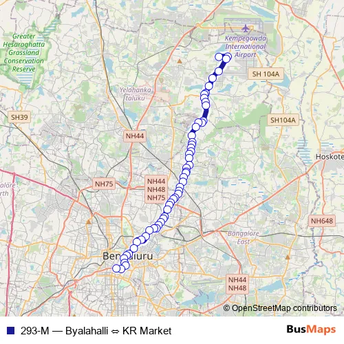 The first stop of the 293-M bus route is Byalahalli and the last stop is KR Market. 293-M (Byalahalli ⇔ KR Market) is operational during everyday.