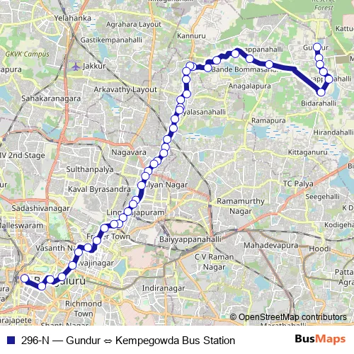 The first stop of the 296-N bus route is Gundur and the last stop is Kempegowda Bus Station. 296-N (Gundur ⇔ Kempegowda Bus Station) is operational during everyday.