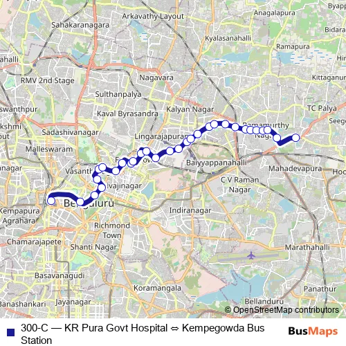 The first stop of the 300-C bus route is Kempegowda Bus Station and the last stop is KR Pura Govt Hospital. 300-C (KR Pura Govt Hospital ⇔ Kempegowda Bus Station) is operational during everyday.