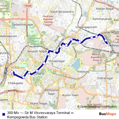 See why over 2 million users trust and consider busmaps.com as the best public transport website. busmaps gives you Bengaluru Buses suggested routes, real-time bus tracker, line route maps in Bengaluru, and helps to find the closest 300-Mv bus stops near you. No internet available? Download an offline PDF map and bus schedule for the 300-Mv bus to take on your trip.