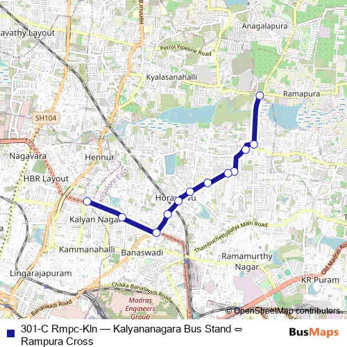 The first stop of the 301-C Rmpc-Kln bus route is Rampura Cross and the last stop is Kalyananagara Bus Stand. 301-C Rmpc-Kln (Kalyananagara Bus Stand ⇔ Rampura Cross) is operational during everyday.