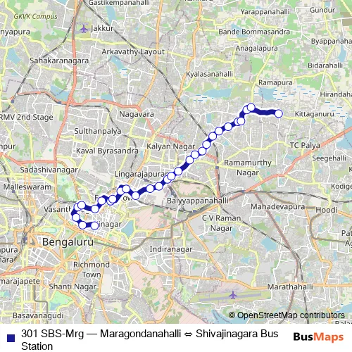 The first stop of the 301 SBS-Mrg bus route is Shivajinagara Bus Station and the last stop is Maragondanahalli. 301 SBS-Mrg (Maragondanahalli ⇔ Shivajinagara Bus Station) is operational during everyday.