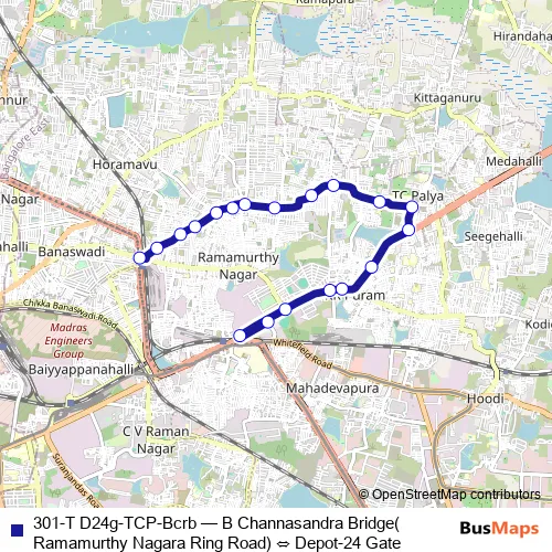 The first stop of the 301-T D24g-TCP-Bcrb bus route is Depot-24 Gate and the last stop is B Channasandra Bridge(Ramamurthy Nagara Ring Road). 301-T D24g-TCP-Bcrb (B Channasandra Bridge(Ramamurthy Nagara Ring Road) ⇔ Depot-24 Gate) is operational during everyday.