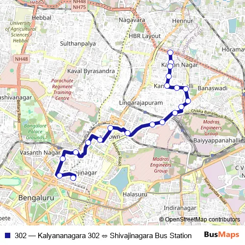The first stop of the 302 bus route is Kalyananagara 302 and the last stop is Shivajinagara Bus Station. 302 (Kalyananagara 302 ⇔ Shivajinagara Bus Station) is operational during everyday.
