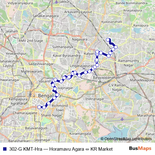 Horamavu Agara. 302-G KMT-Hra (Horamavu Agara ⇔ KR Market) is operational during everyday.